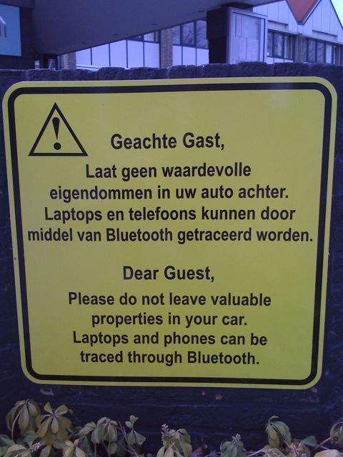 Bij een hotel langs de snelweg zag ik onderstaand warschuwingsbord. Het bord waarschuwt de bezoekers ervoor dat zij apparaten met buetooth niet in de auto moeten laten liggen. Dieven gebruiken bluetooth namelijk om te bepalen of er waardevolle spullen in de auto liggen.